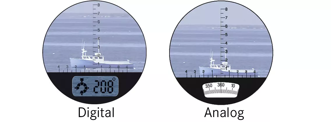 Встроенные компасы, наложенные на линзу, позволяют пользователю отслеживать курс объекта, который не был бы виден в обычный бинокль. Бинокль со встроенным компасом может оказаться очень полезным при навигации на борту судна. Если перед вами стоит выбор: бинокль с компасом или бинокль без компаса, то мы рекомендуют всегда приобретать версию с компасом, если бинокль предполагается использовать в активной среде.