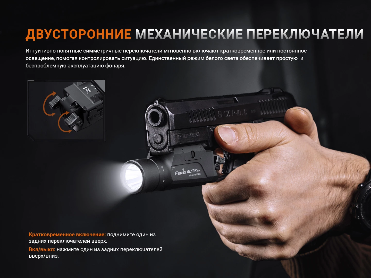 Благодаря двусторонним механическим переключателям управлять работой тактического фонаря можно как правой, так и левой рукой. Для кратковременного включения светодиода необходимо поднять один из переключателей, для включения/выключения освещения — нажать на регулятор вверх/вниз. В комплект входят 2 пары запасных переключателей разной длины, которые пользователь может установить, исходя из личных предпочтений.
